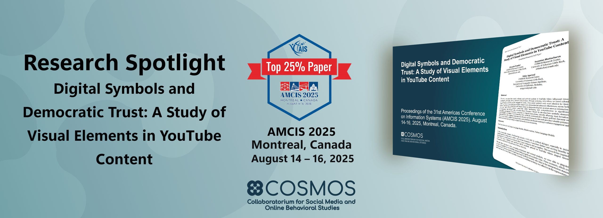 This month, we highlight groundbreaking COSMOS research examining how social, cultural, and political symbols in YouTube videos shaped viewer engagement and trust during Taiwan’s 2024 election. Recently presented at the 31st Americas Conference on Information Systems (AMCIS 2025) held in Montreal, Canada and honored among the Top 25% papers, the study was recognized for its innovative integration of media and information systems theory. At its core, the research addresses a critical question: Which types of symbolic content most effectively foster democratic trust and drive engagement?